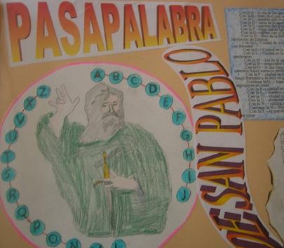 Documentación. Agradecemos la aportación del Blog de la DDE de León ( http://relideleon.blogspot.com ) por la publicación del LIBRO VIAJERO de san Pablo y, también al profesorado de Religión del C.P. Ribas del Sil que trabajó con sus alumnos el pasapalabras de san Pablo, del que hemos tomado la mayor parte de palabras y preguntas para darle formato digital. Añadimos abajo uno de los carteles del cartel del pasapalabras realizado en el C.P. Ribas del Sil. Gracias, amigos.