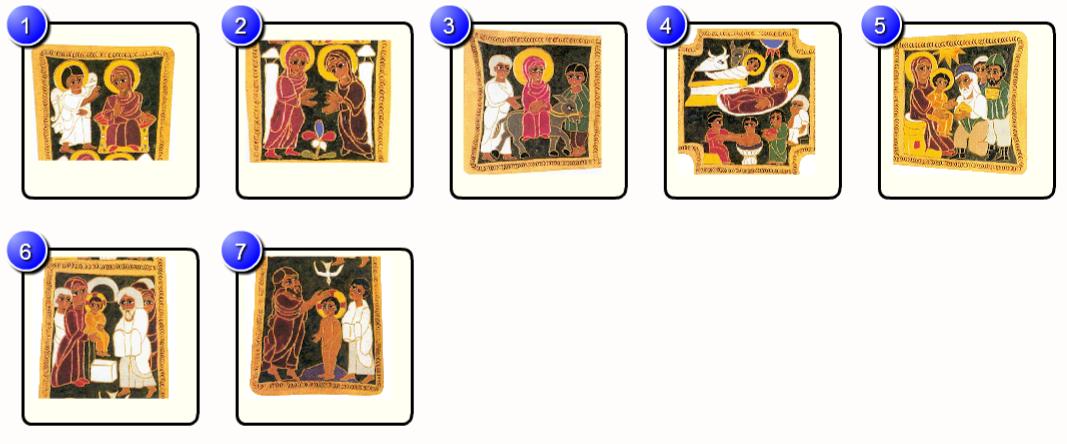 - Drag the pictures and the name of the biblial passages to put in order Jesus's childhood scenes: